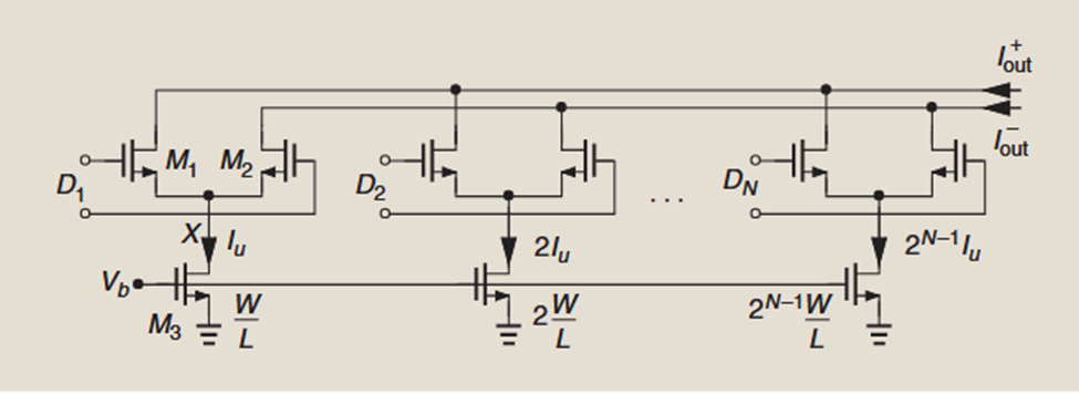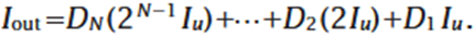 Now we wish to convert an N-bit digital signal, Din ,to an analog current I out.This can be accomplished as shown in figure1(a).where each input bit controls a current that is binarily