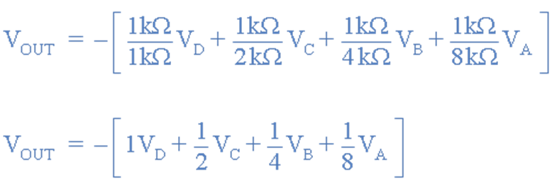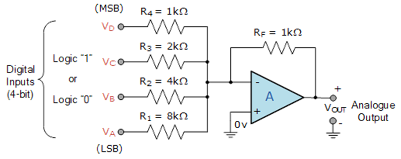For a 4-bit binary number there are 2^4 = 16 possible combinations or A, B, C, and D ranging from 0000 to 1111 which corresponds to decimal 0 to 15 respectively. If we assign weights to each input bit such that each bit has double the weight of the previous bit , it will create binary codes with weight 8,4,2,1. Weights here can be physically interpreted with the value of resistances.