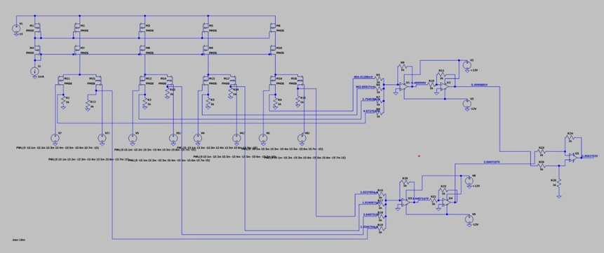 This table demonstrates the difference between the output voltages produced by the current switching and current steering DACs. In diff voltage (V), the issue of noise is eradicated, as both the inverting op-amps produce the same amount of error due to the environment, so both errors then get inputted in the subtractor and hence add up to zero in the end. Then also the issue of common mode error gets eliminated as margin between voltages increases to 1 which is comparable to the increase between the binary values, so the error is now less significant. The circuit implementation of this is shown below: