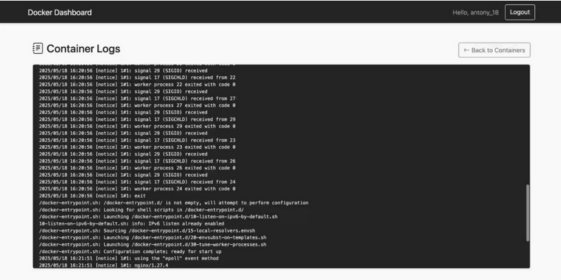 To address this issue, this project introduces a web application that enables visual and intuitive container management. The application abstracts the complexities of Docker commands and provides a streamlined interface for performing basic container operations. Users can log in securely, view the status of running and stopped containers, interact with them via clearly labeled action buttons and view logs of all the containers that are spun up.