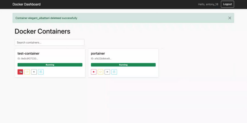 - Container data (IDs, names, statuses) is fetched and rendered in the frontend.