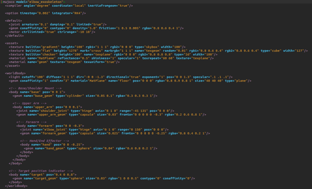 For mechanical and structural design, CAD tools like Fusion 360 enable the creation of anatomically accurate exoskeleton models, supporting precise joint alignment and ergonomic comfort. These digital prototypes are essential for iterative development and can be seamlessly integrated with simulation environments for validation before physical prototyping. This project builds upon these foundations by developing a full AAN control loop for an elbow exoskeleton. The approach leverages MuJoCo for simulation, Python for control logic, and Fusion 360 for mechanical design. Literature demonstrates that such interdisciplinary integration leads to more effective, personalized rehabilitation systems that hold promise for real-world clinical applications (1) (3) (5).