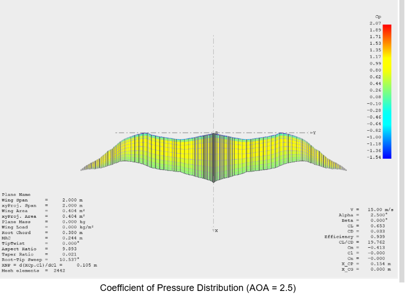 Next, an Albatross-shaped wing was modelled on XFLR5, using about 108 sections and 2442 mesh elements to ensure accurate results. This model was then simulated on XFLR5, using the Ring Vortex (VLM2) analysis method with viscous flow at a headwind velocity of 15 m/s. All the other parameters were considered according to sea level conditions. The analysis was carried out between -2° to +2.5°, while keeping an increment of 0.5°. Beyond 2.5 degrees, the VLM2 Analysis method provides inaccurate results.
