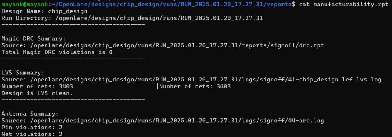Post-layout verification is a crucial step in the ASIC design flow. This ensures the design is physically manufacturable and electrically correct. The following checks were performed using OpenLane, and the results confirm the successful completion of the flow with minimal issues.