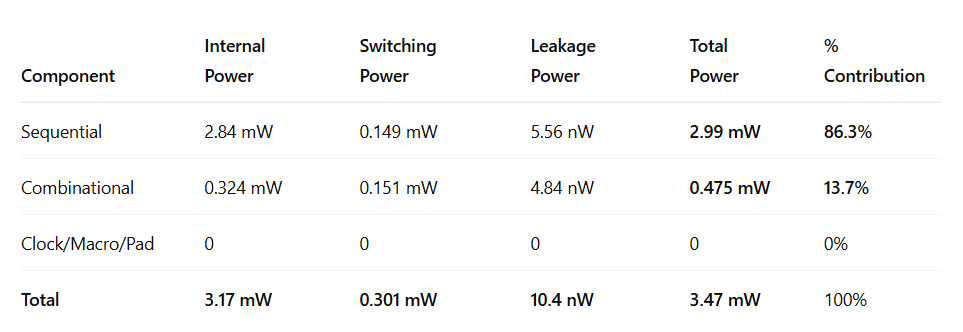 Power Efficiency: Achieved low power consumption of ~3.47 mW, mostly dominated by sequential logic.